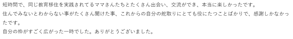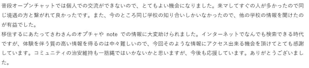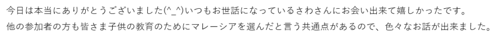 HOME > 交流会・座談会 > 交流会・座談会 客户的声音 来之客户的声音 2023年9月5日 2024年3月22日 GLOBRIDGE为父母之间提供了许多交流、信息交换和信息收集的网络平台。 实施例: Meet Up活动举办时(实施于9月1日)的情况 活动结束后,我们收到了许多客户的反馈意见,现在将其介绍给您。 A・S様(Meet Up) I・S様(Meet Up) M様(Meet Up) Y・K様(Meet Up) 我们将继续举办许多网络活动。 非常期待大家的参与。 -交流会・座談会, 客户的声音